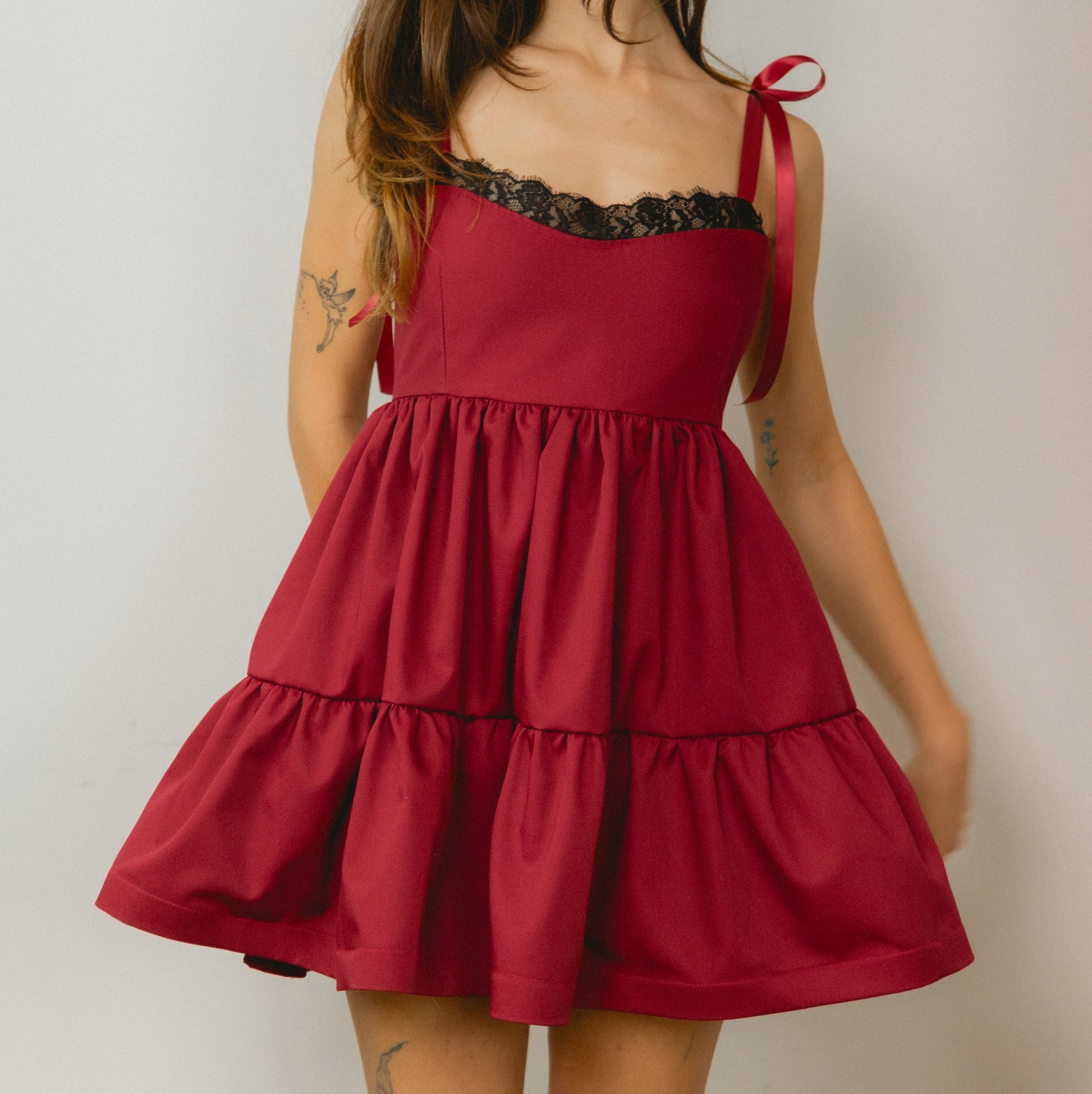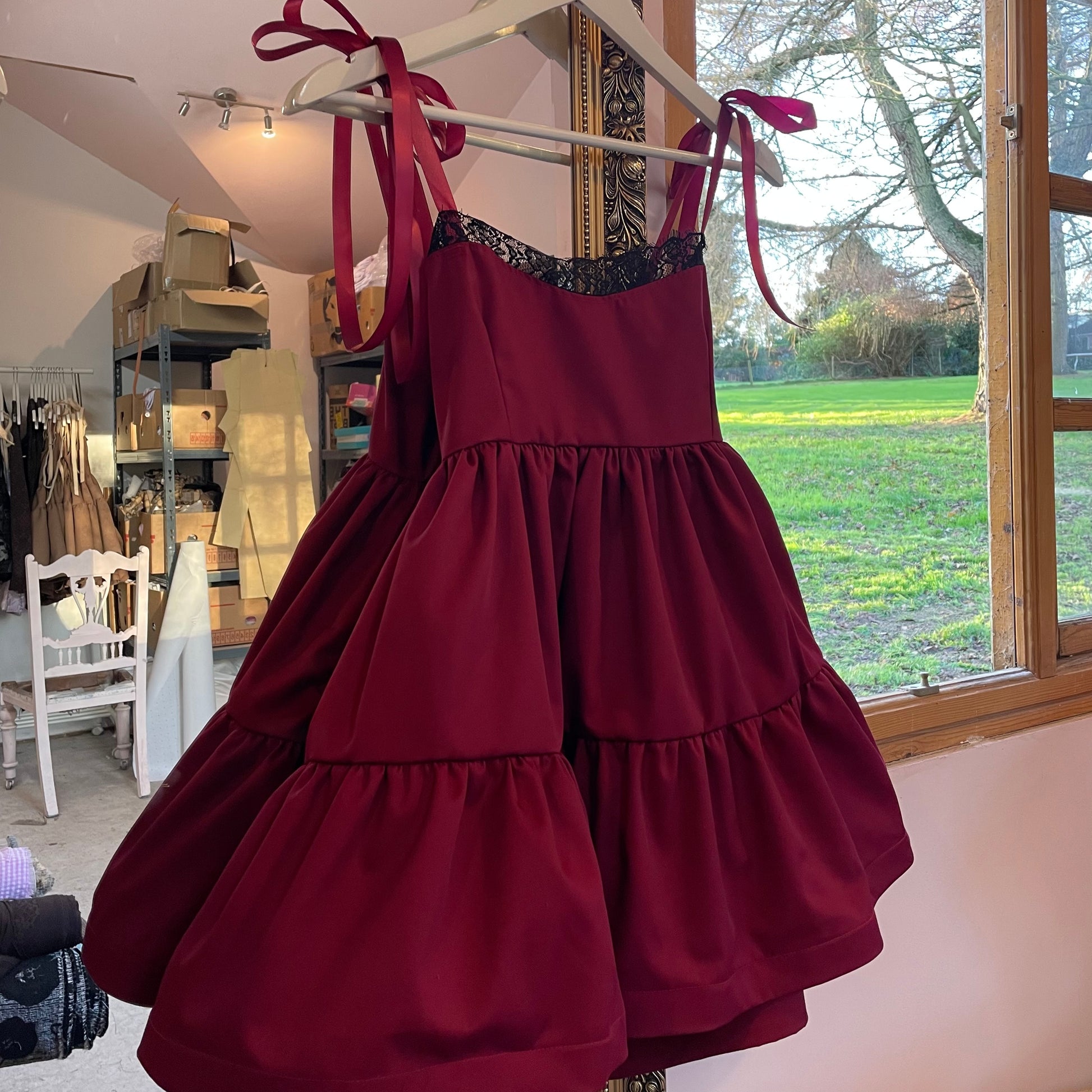 Our best selling smock dress is back in a new style! Handmade from the most beautiful deep red heavy suiting fabric, making her perfect for all of your festive events! Featuring deadstock black lace trim, adjustable ribbon bow tie straps and an elasticated back. The structured hem gives the dress a super voluminous fit, with the weight making the back slightly longer to eliminate any coverage worries!