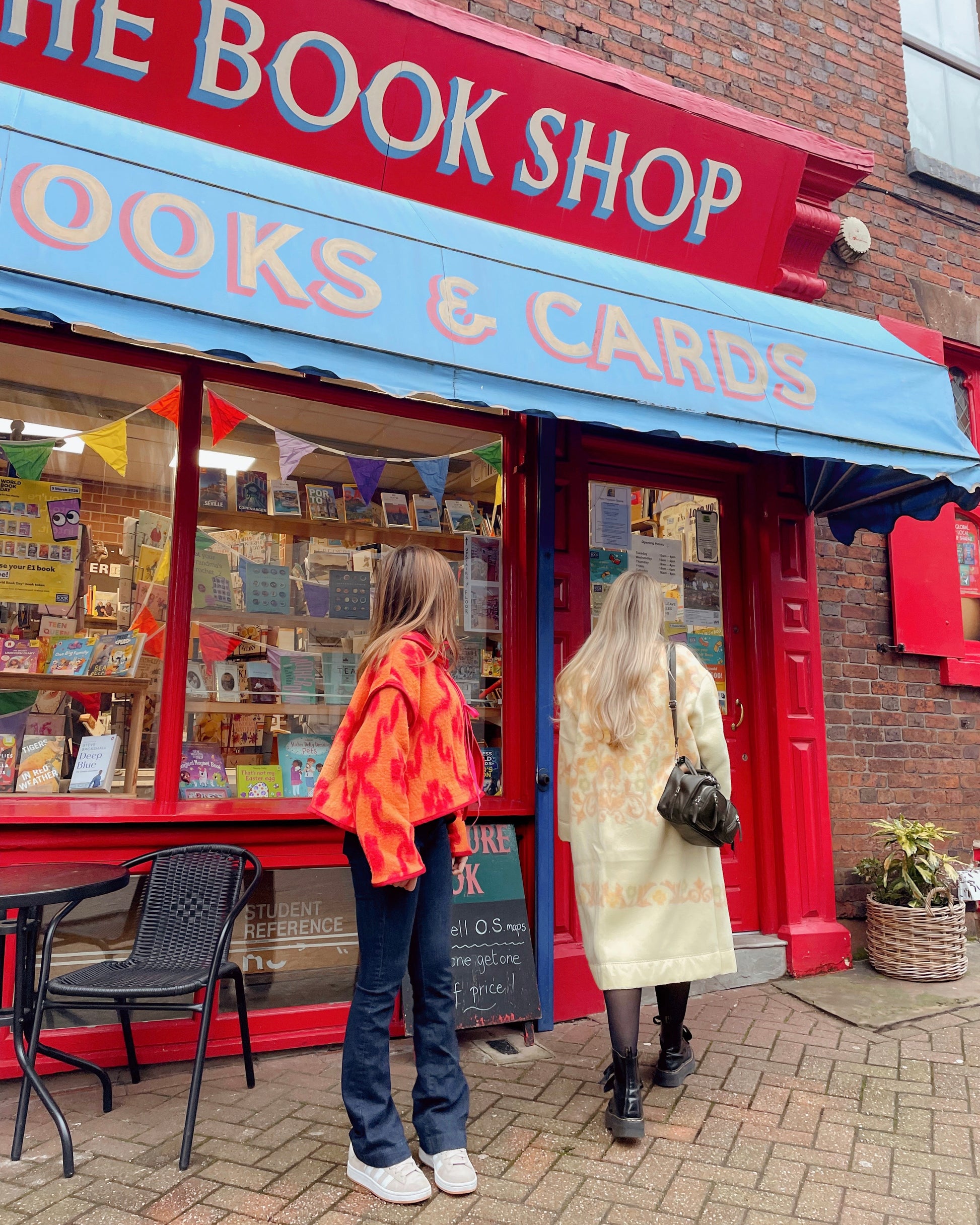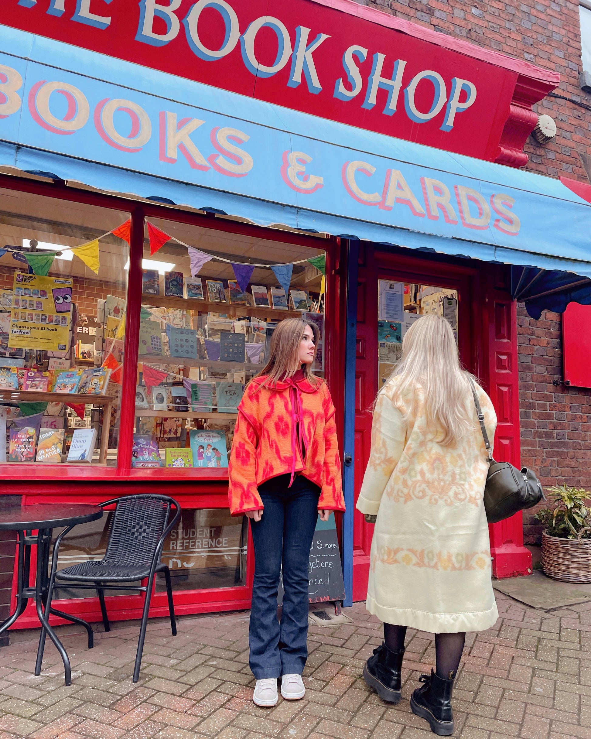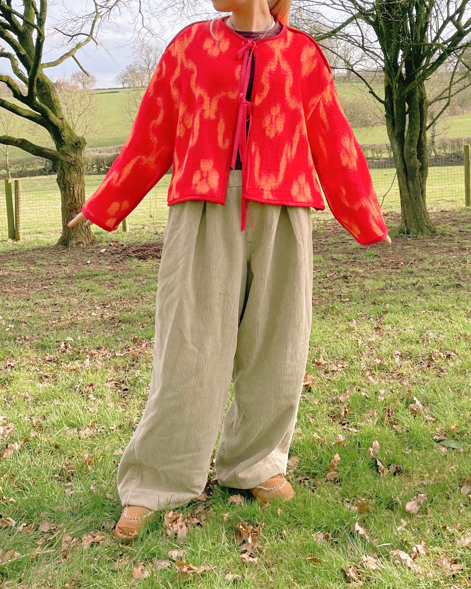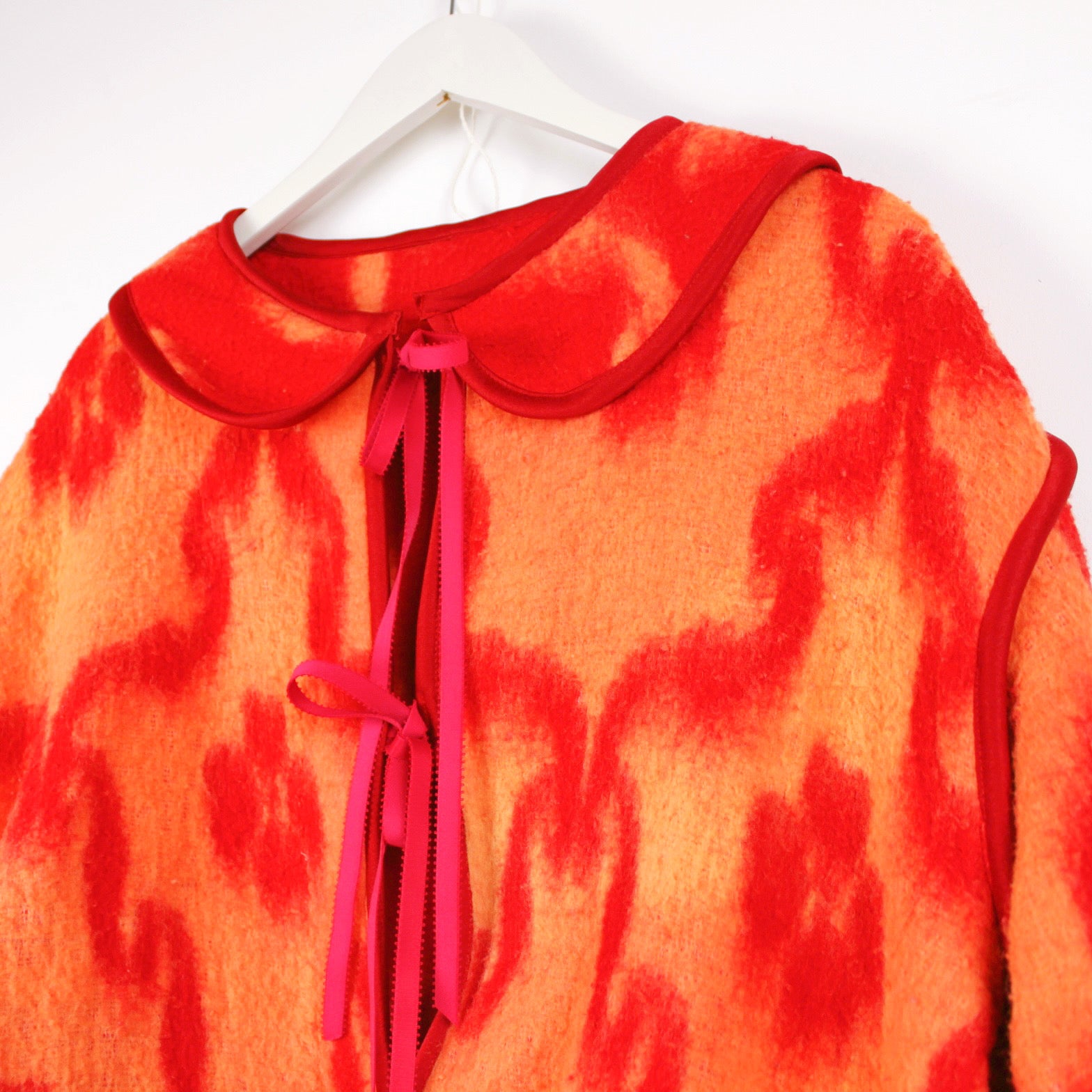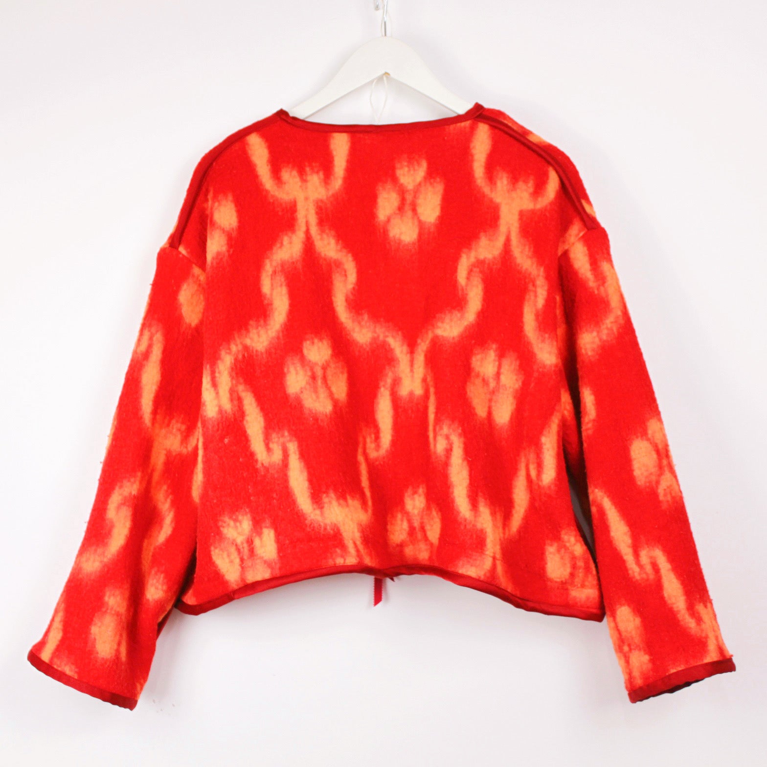 Our Peach Blanket Jacket, handmade from the most beautiful 70’s vintage camper van blanket. She’s reversible, one side mainly peach with red print and collar detailing, and the other mainly red, with peach print and no collar. There will only be one of her, so she’s such a special piece