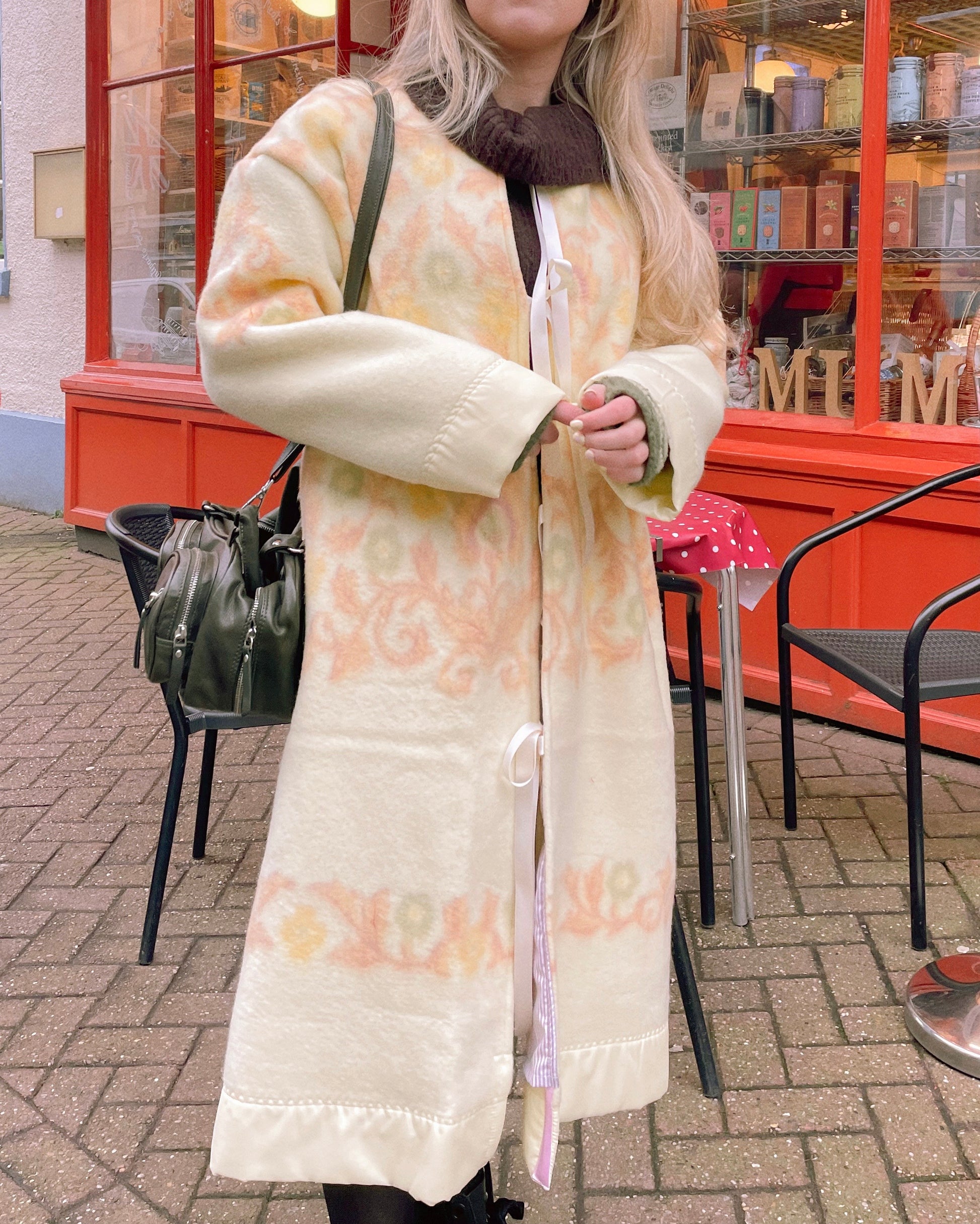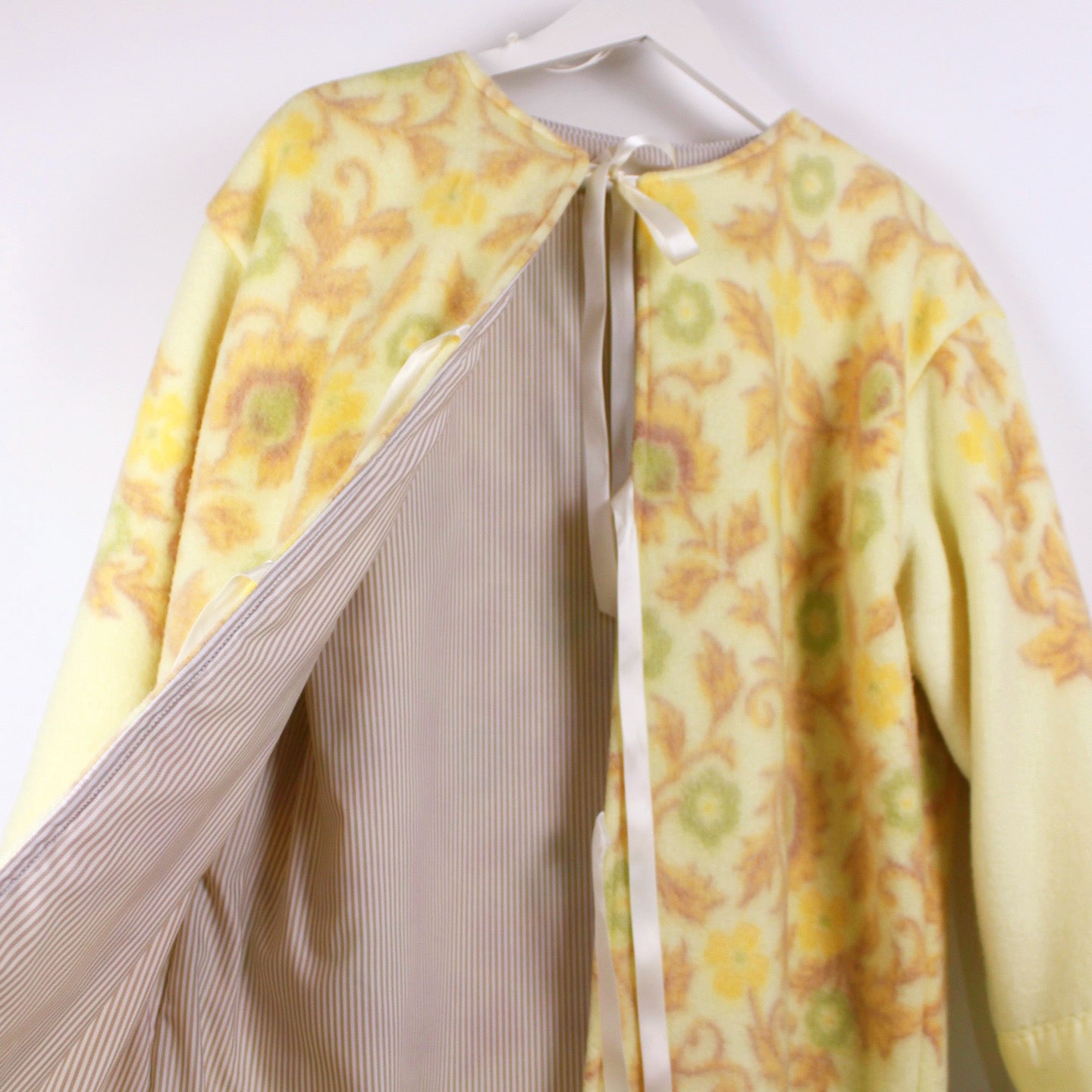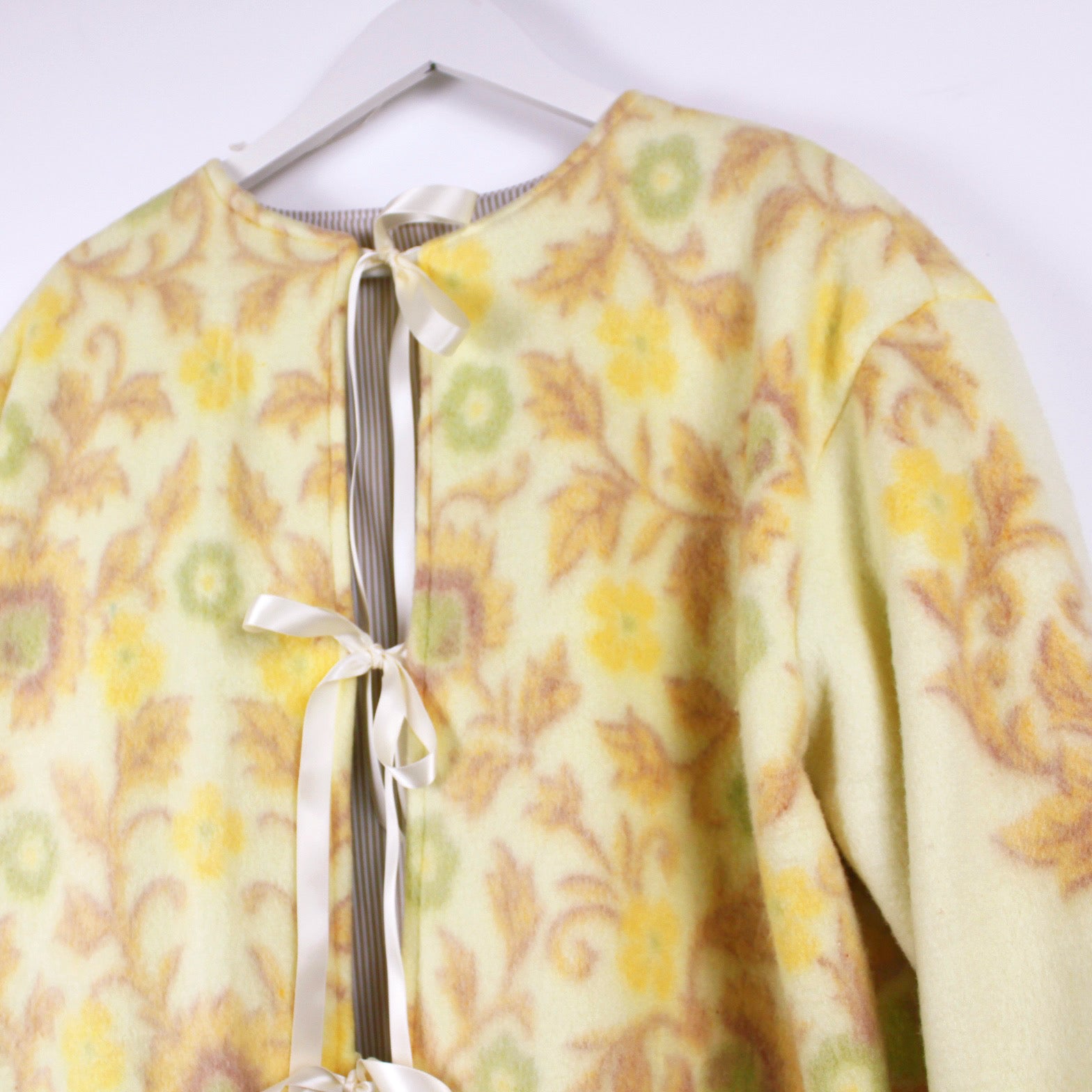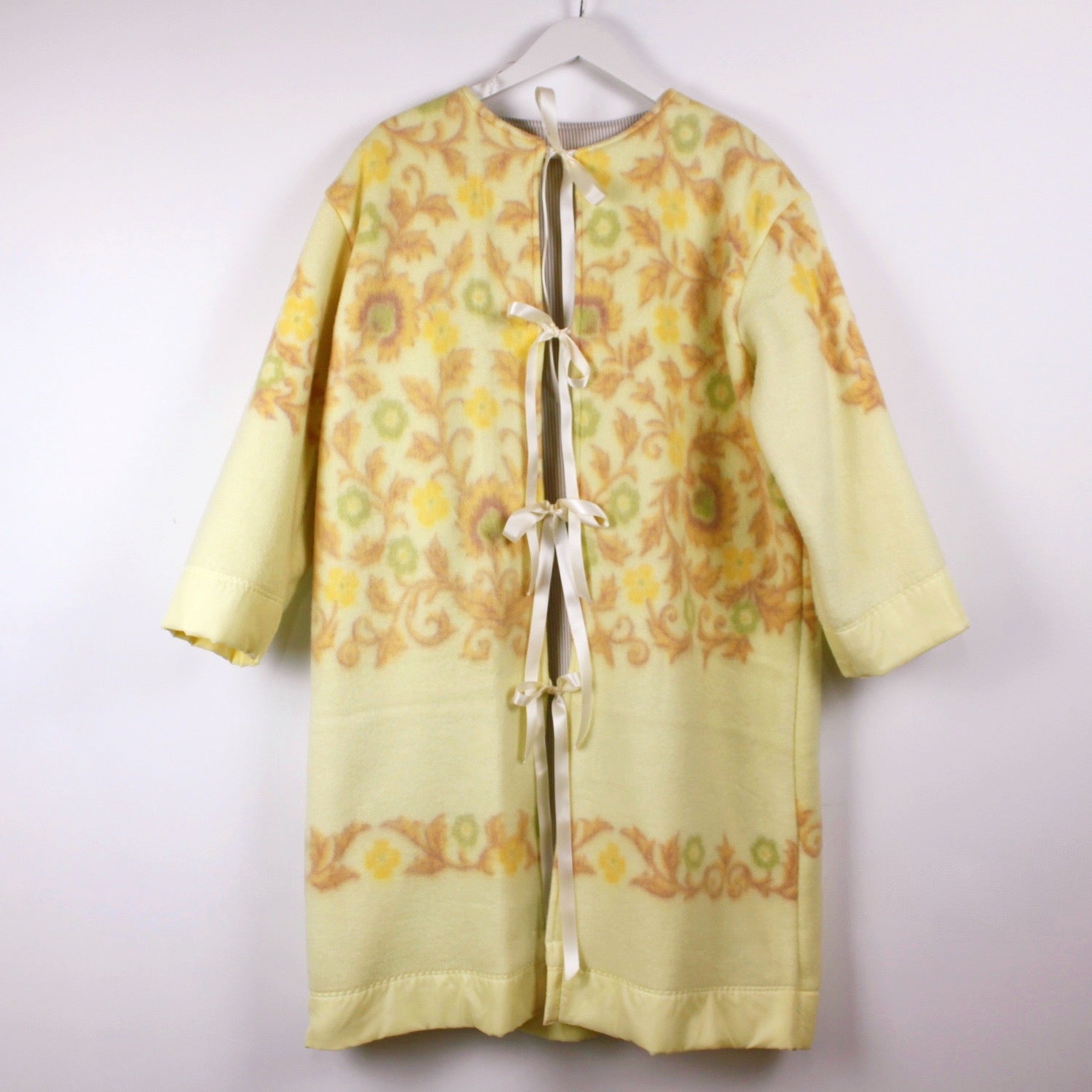 Our Butter Yellow Blanket Coat, handmade from the most beautiful vintage cream yellow blanket with peach and green floral print, and lined with deadstock fabric. The original satin edge to the blanket has been kept as a feature, with deadstock ribbon bow ties to fasten. Truly a very special, one of a kind piece